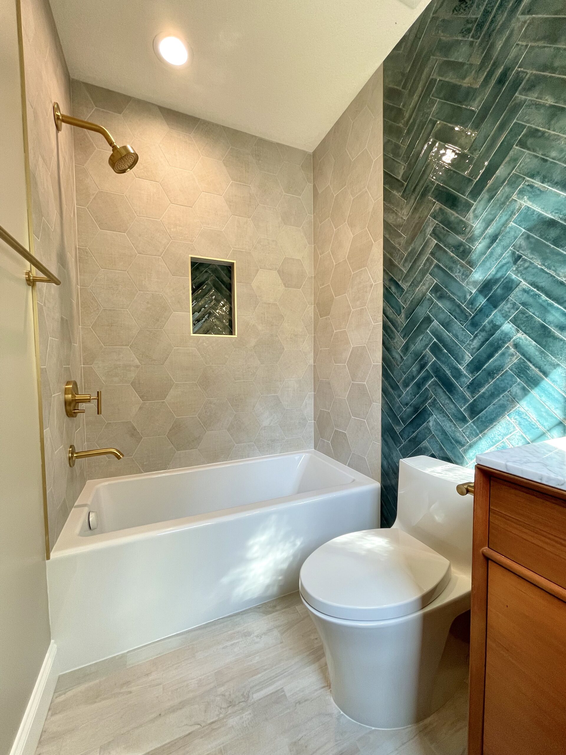A bathroom size of 5' x 10' will cost approximately $18,000 to $25,000 for floor replacement, new fixtures, vanity, and tub with surround